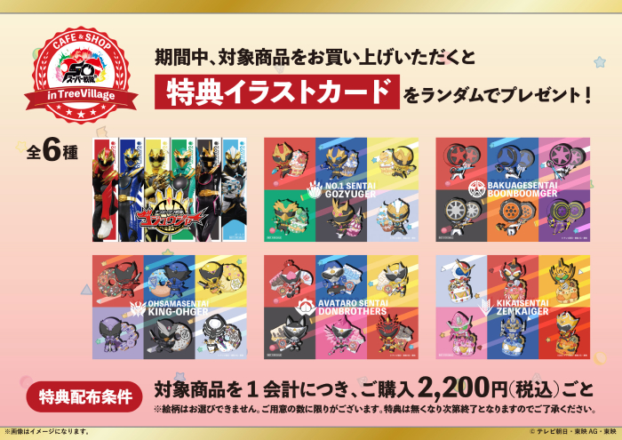 ツリービレッジオフィシャル通販サイトにて『スーパー戦隊50周年 CAFE & SHOP in TreeVillage』商品を2,200円(税込)お買い上げごとに1枚、「特典イラストカード(全6種/ランダム)」をプレゼント!