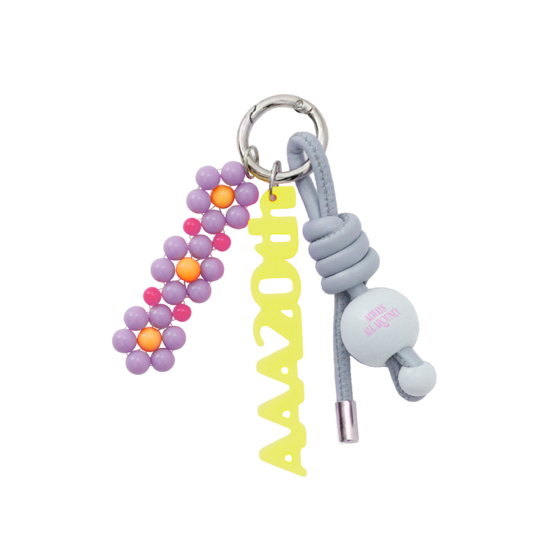 「AAA 20th Anniversary」のロゴをかたどったプレートやフラワービーズ、レザーストリングなどカラフルな組み合わせがポイントのキーリング。