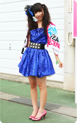 ブルーのドレスにくぅちゃんのタオルを羽織ったキュートなコーデ。ピンクのパンプスもタオルに合ってて素敵!