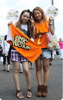 鮮やかなオレンジ色が目立つJUNSU/JEJUNG/YUCHUNグッズでキメたふたり。