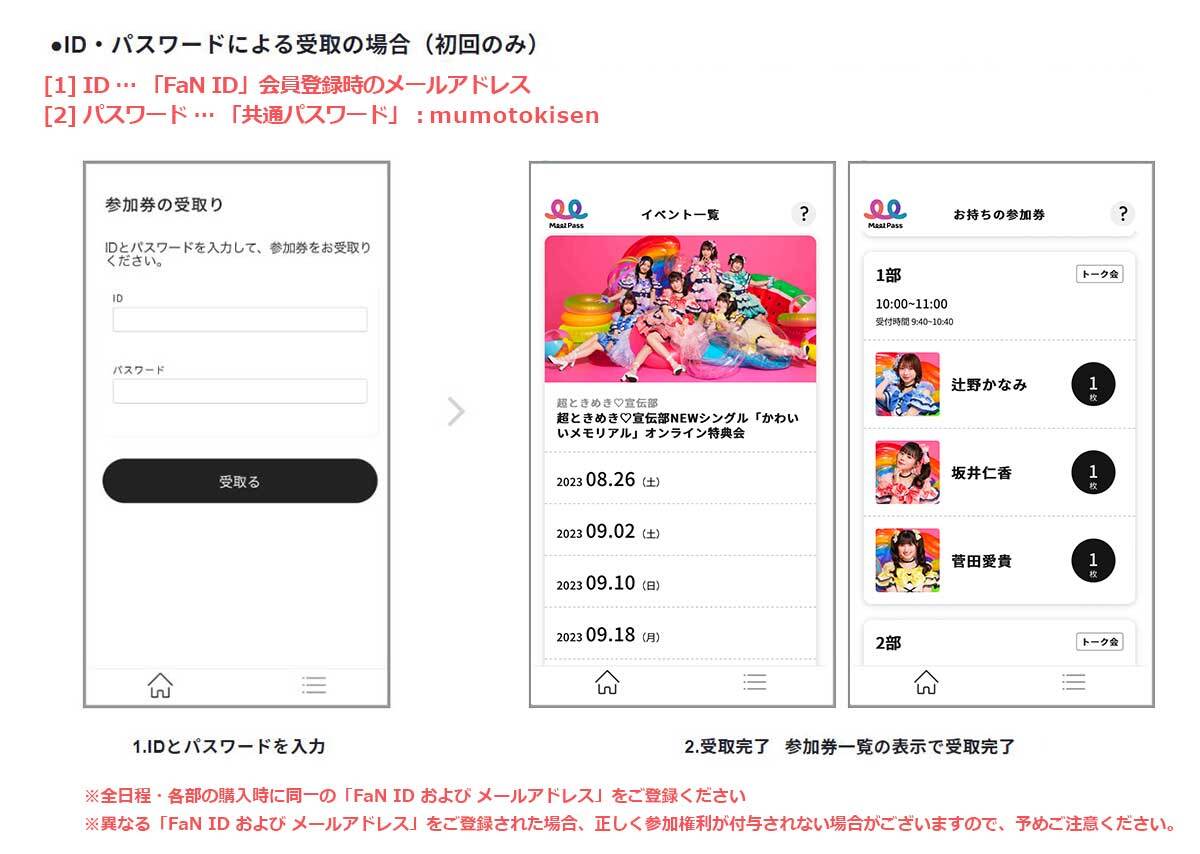 連携アプリ「Meet Pass」へのログイン、イベント参加登録 参加券の受け取りには以下の2点が必要になります [1] 「FaN ID(旧+ID)」会員登録時のメールアドレス [2] 「共通パスワード」:mumotokisen SAMPLE画像をクリックすると拡大できます ※実物とはデザイン等が異なります